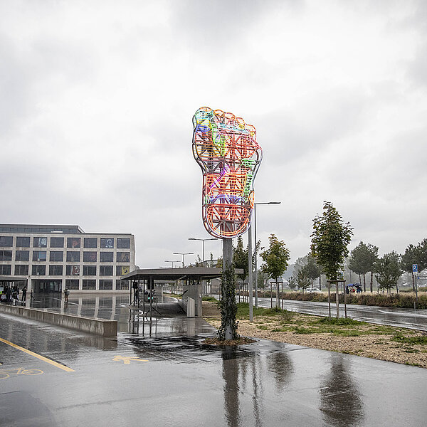 Mais revenons sur l’histoire de cette oeuvre. Ce pied a été conçu par une artiste française, Chloé Delarue. Elle est diplômée de la Villa Arson (Nice) et de la HEAD (Genève). Son œuvre d’art s’intitule “Le chant des lucioles”. C’est le premier projet du pour-cent culturel de la ville d’Yverdon-les-Bains. Cette initiative prévoit qu’une somme soit mise de côté lors de chaque gros projet urbanistique ou routier afin de financer une oeuvre qui accompagnera certains de ces projets.