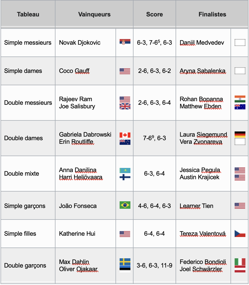 Après 13 jours de matches et 7 tours, Novak Djokovic a remporté la finale en catégorie « simples messieurs » contre Daniil Medvedev 6-3 7-6 6-3 après avoir éliminé Ben Shelton, Taylor Fritz et Borna Gojo.
