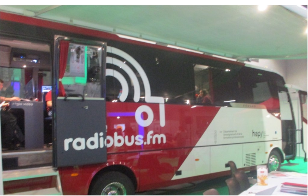 Tout d’abord c’est un canal de diffusion permanant, qui diffuse des émissions radios sur le web sur ordinateur connecté ou sur smartphone sur l’application gratuite “RadioBus” et en DAB+ ou temporairement sur la bande FM. C’est une radio dans un bus qui accueille les élèves pour qu’ils puissent animer une radio en faisant des chroniques ou des interviews. Le bus se déplace dans les établissements scolaires ou parfois dans des manifestations (ici au salon des métiers). Comme on peut voir sur la photo, les animateurs entrent à l’avant du bus et les techniciens à l’arrière.