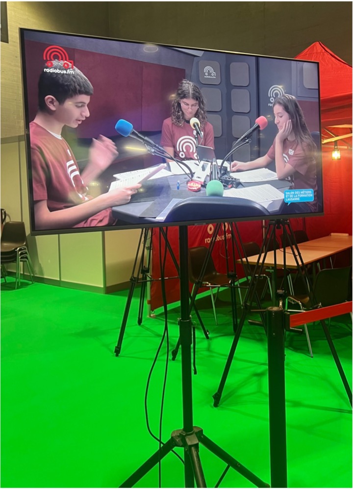 Pendant que les élèves sont en direct à la radio, un écran à l’extérieur du bus permet de les voir en action. (Cf. photo).