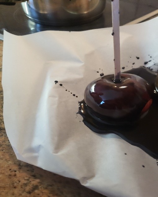 - Tremper les pommes dans le caramel, en les enrobant bien.