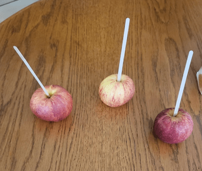 - Retirer la tige, puis enfoncer des bâtonnets jusqu’aux 2/3 de la pomme, sans la traverser.