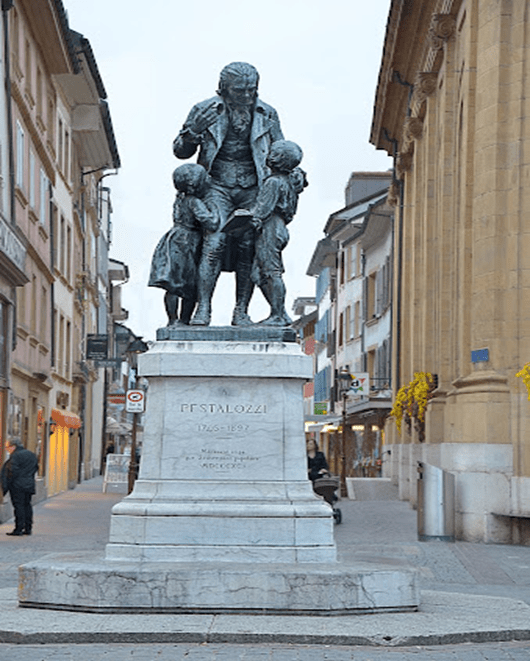 Au 19e siècle un homme nommé Johann Heinrich Pestalozzi est arrivé à Yverdon. C’était un pédagogue (c’est-à-dire quelqu’un qui réfléchit à l’enseignement) très connu. Il a réfléchi à une nouvelle méthode d’enseignement qui consistait à éduquer les enfants dans la bienveillance et dans le respect. Voici une image de sa statue que vous allez sûrement reconnaitre.