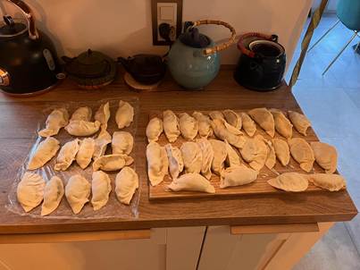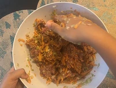 Ensuite, prenez les 150 g de viande, le vin blanc, l’huile de sésame toasté, la sauce soja, le nuoc-mâm (sauce de poisson), le sucre et le poivre puis mélangez le tout. Essorez le chou, ajoutez le chou essoré dans la viande avec le poireau et les carottes, mélangez puis mettez un film plastique pour laisser reposer durant la préparation de la pâte.
