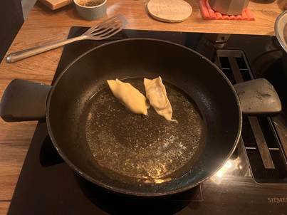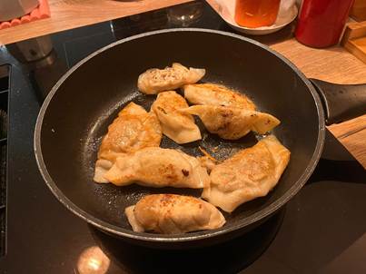 Mettez une càc d’huile de tournesol avec les gyoza dans une poêle et allumez à feu moyen, puis rajoutez 100 ml d’eau. Faites cuire à la vapeur pendant 7 minute. Une fois l’eau évaporée, ajoutez un filet l’huile de sésame toasté pour leur donner une couleur dorée. Vérifiez la couleur des gyozas, lorsqu’ils sont bien dorés, c’est prêt!