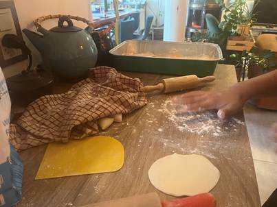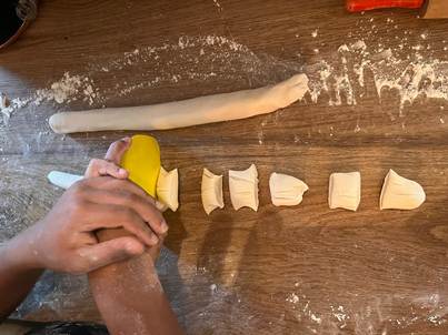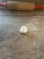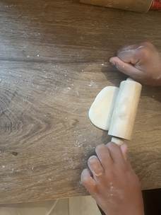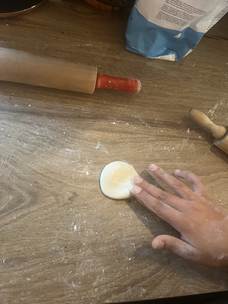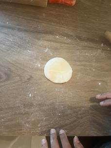 Reprenez la pâte et séparez-la en deux. Prenez une des deux parties et mettez l’autre dans le film plastique. Faites un tuyau de 2,5 cm de diamètre. Découpez-en10 morceaux égaux et recouvrez-les d’un chiffon ou un papier humide. Formez un morceau de pâte en forme cylindrique et écrasez-le avec la paume des deux côtés. Utilisez un rouleau à pâtisserie et étalez la pâte finement. Répartissez la pâte verticalement, horizontalement et en diagonale pour obtenir une forme ronde.