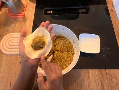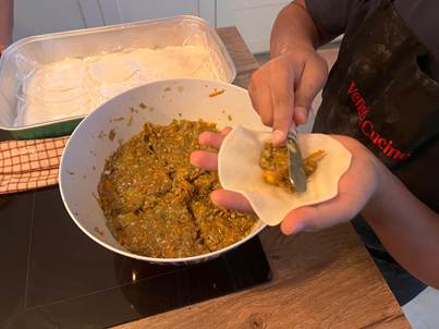 Maintenant, nous allons envelopper la viande avec la pâte. Divisez la viande en 4 parties. Prenez une pâte et mettez de la viande à l’intérieure ensuite mettez un peu d’eau autour de la pâte. Commencez par plier légèrement en deux et commencez à plier à partir du bord. Faite des plis avec la main gauche et appuyez avec la main droite pou fermez la pâte. Faite ça avec toutes les feuilles.