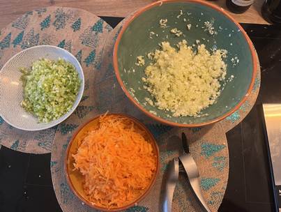 Prenez un couteau et hachez le chou pointu et le poireau séparément. Ensuite râpez les carottes. Puis ajoutez le sel et mélangez pour dégorger le chou. Hachez l’ail et le gingembre, ajoutez-les au poireau.