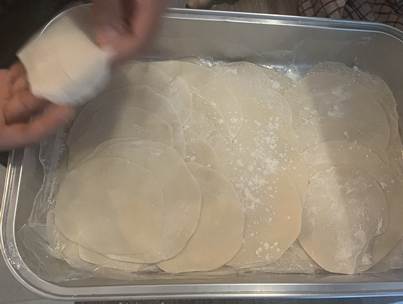 Il faut étaler les bords plus finement. Elle doit faire environ 10 cm de diamètre. Faites cela avec les 20 morceaux. Saupoudrez une fine couche de maïzena pour éviter qu’elles ne se collent entre-elles, Puis disposez-les sur un plateau et recouvrez-les d’un film plastique.