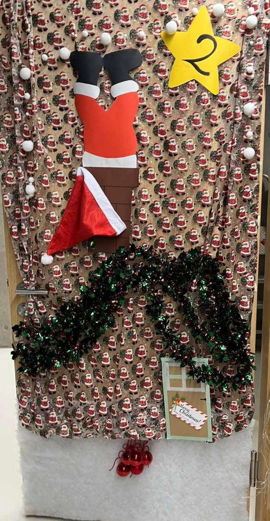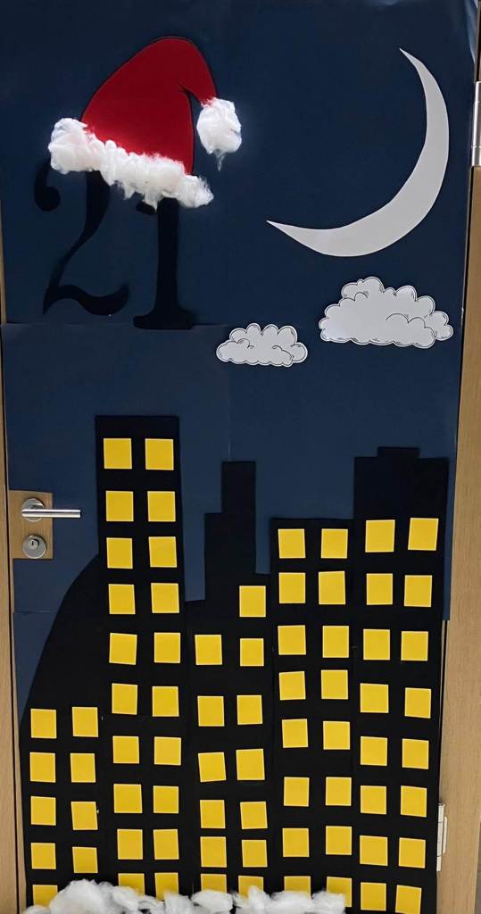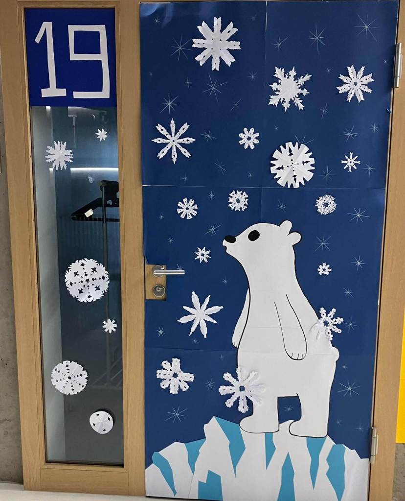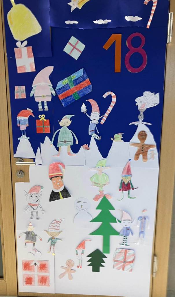 Ma classe a décoré la porte avec des lutins, des montagnes géantes et beaucoup de neige, mais aussi un petit sapin où il y’avait des cadeaux de Noël. Notre numéro de porte était le 18.