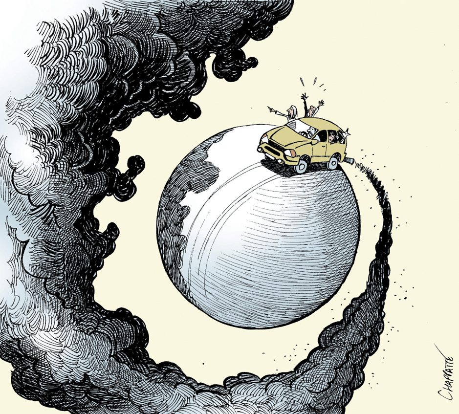 La caricature met en scène une planète. Sur elle, une voiture avec des humains pointe du doigt un immense trainée noire qui sort du pot d’échappement de la voiture.