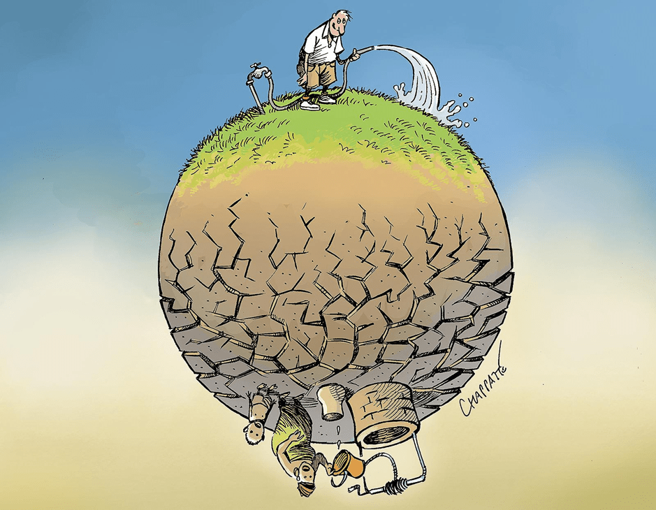 Sur cette caricature nous pouvons observer une planète ronde avec d’un côté un homme arrosant sa pelouse verte et de l’autre de la terre sèche avec une femme et un garçon essayant de prendre de l’eau au puits, mais que quelques gouttes tombent du sceau.