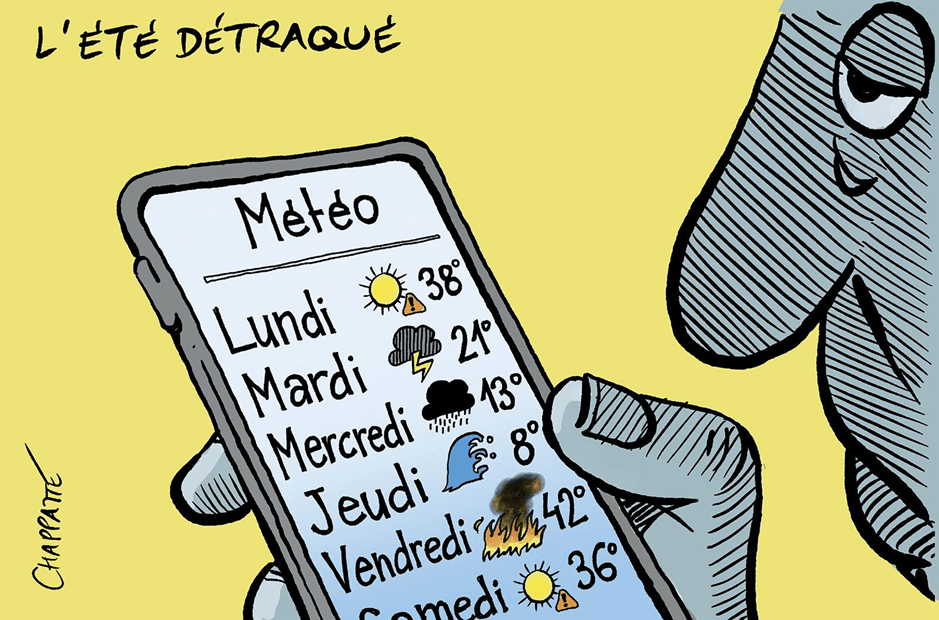 La caricature montre un humain avec son téléphone dans sa main regardant la météo avec des symboles changeant de jour en jour. Le titre de la caricature est l’été détraqué.
