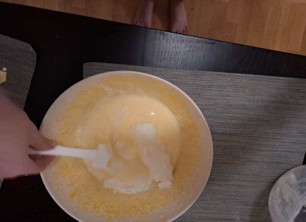 4. Ajoutez les blancs d’œufs aux jaunes d’œufs en 3 parties. Mélangez délicatement.