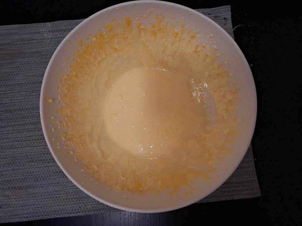 3. Ajoutez le sucre aux jaunes d’œufs puis mixez le toute jusqu’a que les jaunes d’œufs deviennent plus clairs.