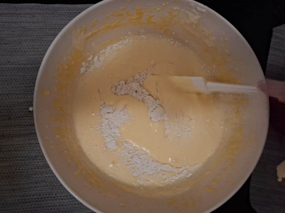 5. Ajoutez la farine en 2 fois. Mélangez délicatement en raclant bien le fond. Puis beurrez et farinez la moule et mettez au four pour 20 à 30 minutes.